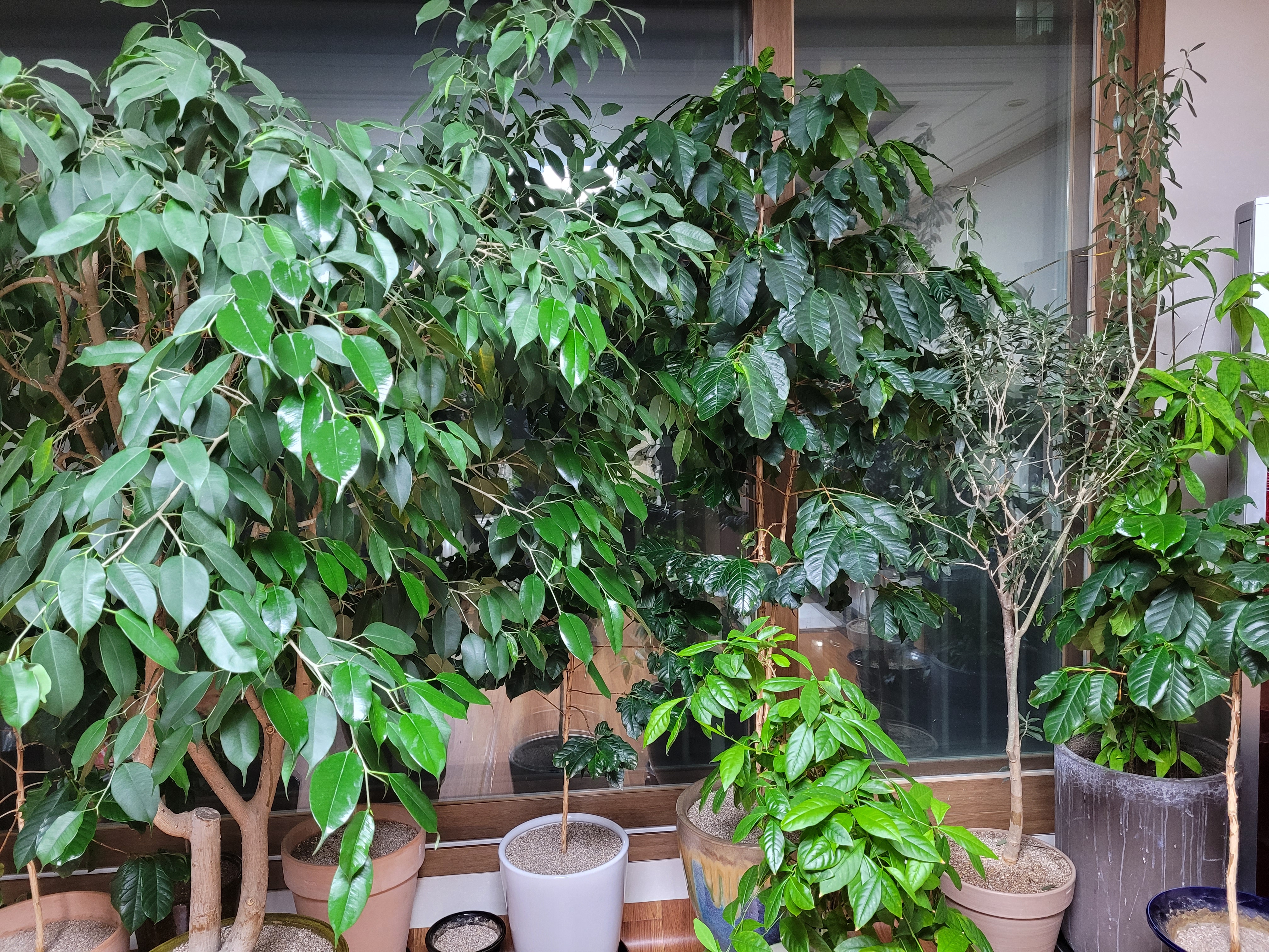 각박한 세상에 마루에 있는 아라비카커피나무 , 올리브나무 , 벤지민등 푸른숲같은 우리집은 작은행복의