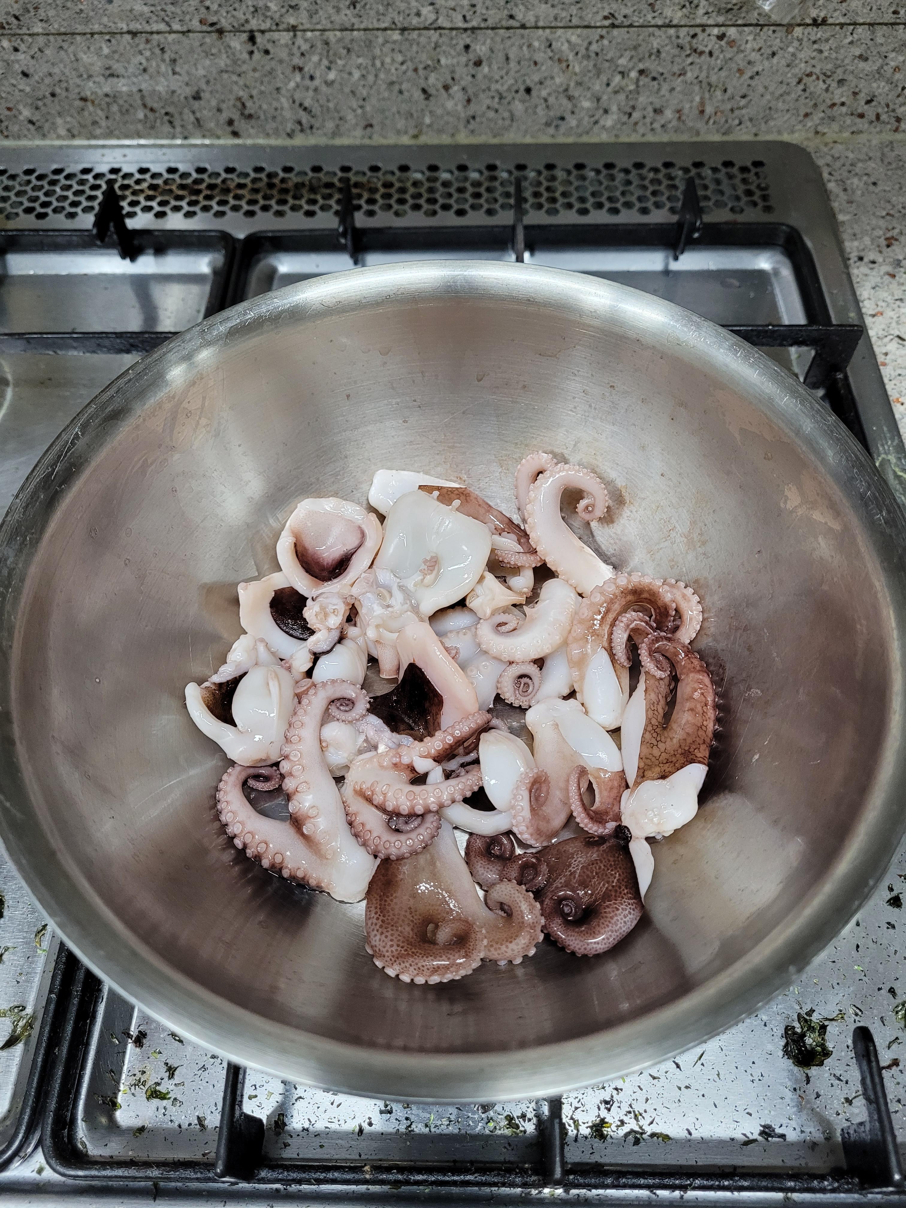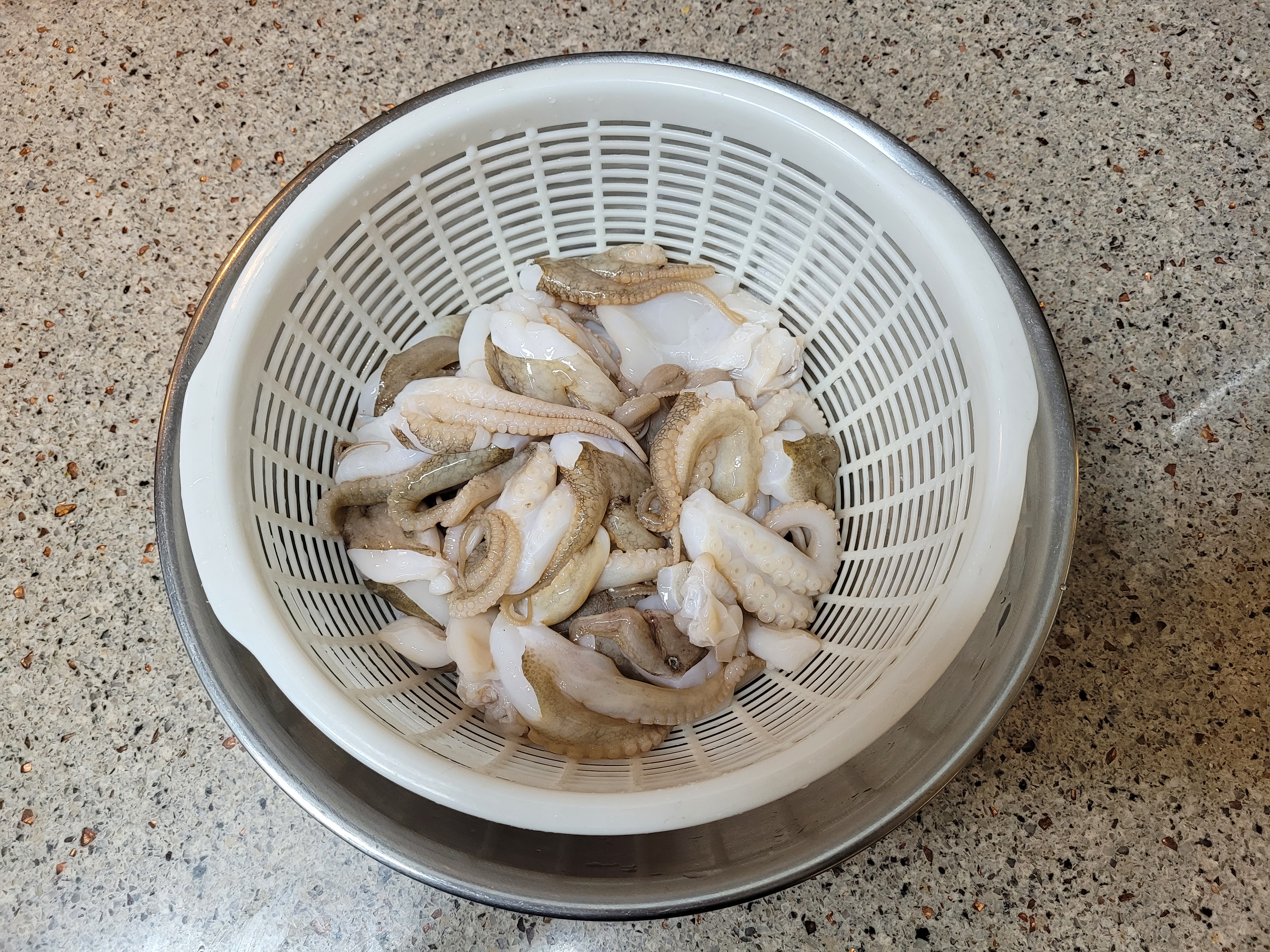 냉동쥬꾸미는 찬물에 40~50분 정도 담궈야 바다의 비릿한 냄새와 염이 탈수된다