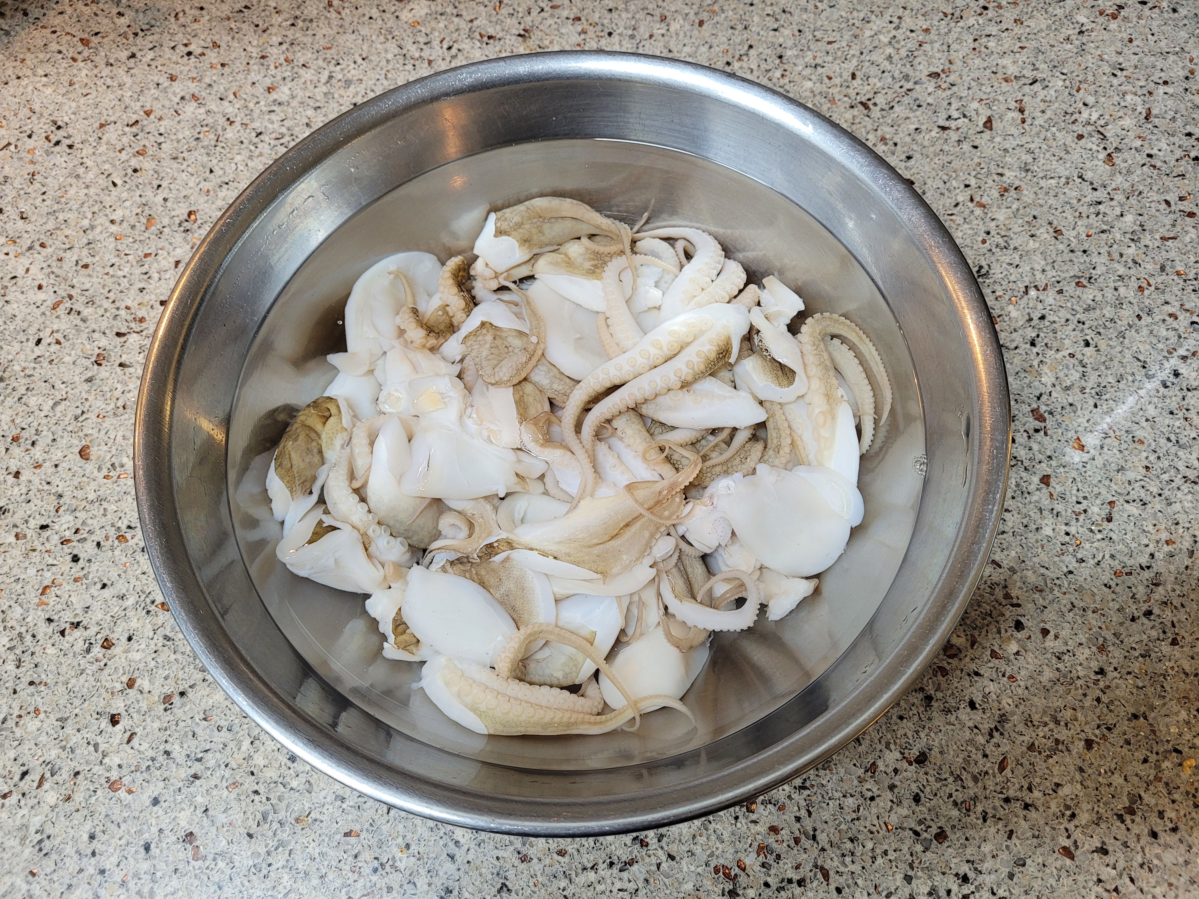 냉동쥬꾸미는 찬물에 40~50분 정도 담궈야 바다의 비릿한 냄새와 염이 탈수된다